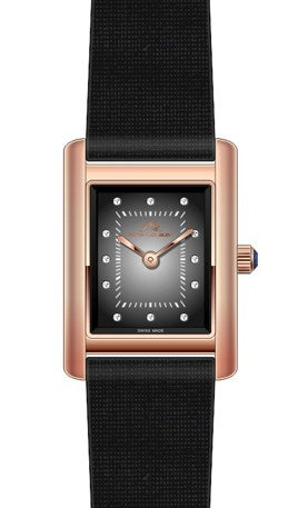 Elegant and timeless, the Karolina features a gradient black dial with genuine, natural diamond hour markers, housed in a rose tone rectangular stainless steel and supple, genuine leather band—a timeless piece that balances style and luxury.
