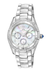 Elegant and bold, the Valentina features a mother‑of‑pearl dial in silver‑tone mother of pearl, housed in a silver‑tone round stainless steel case. Paired with a stainless steel bracelet, protected by a sapphire‑coated crystal, day and date windows keep you on schedule a 24‑hour subdial provides a second time perspective—a refined accessory that exudes romance.
